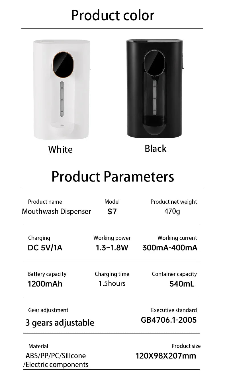 Smart Touchless 540ML Mouthwash Dispenser w/LED, 3 Modes, Wall/Table Mount, 2 Cups,
