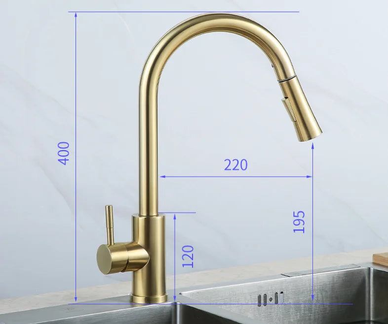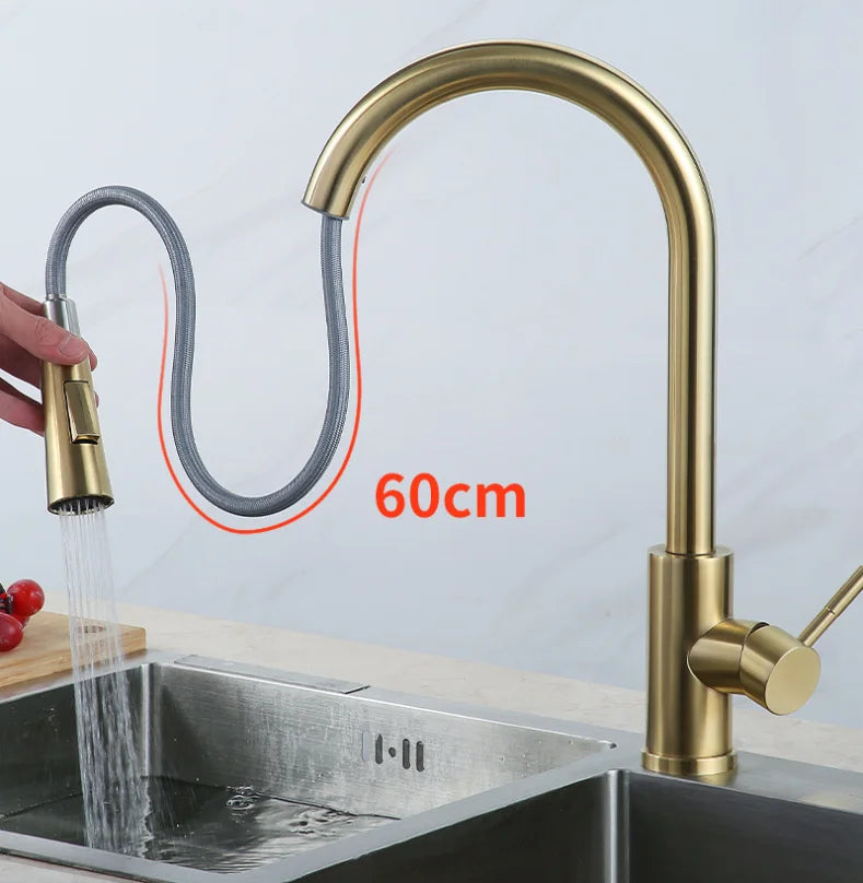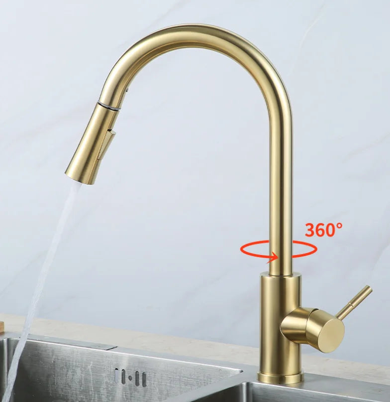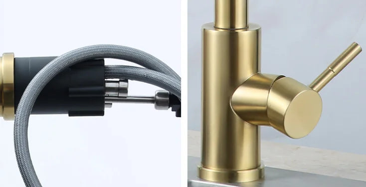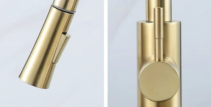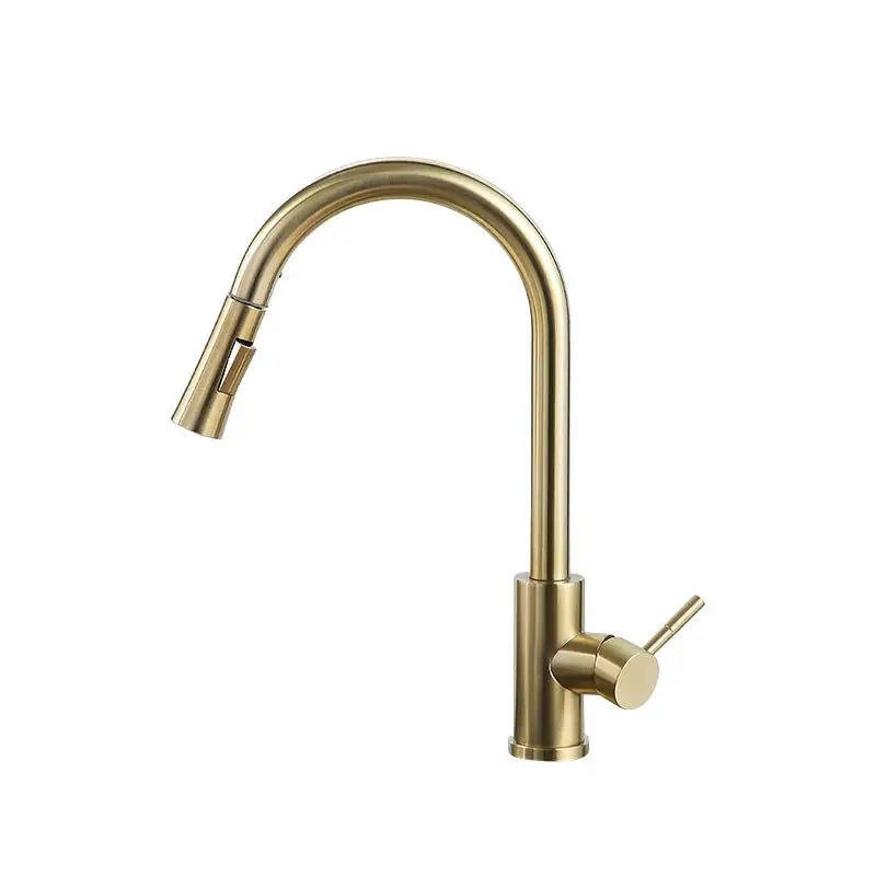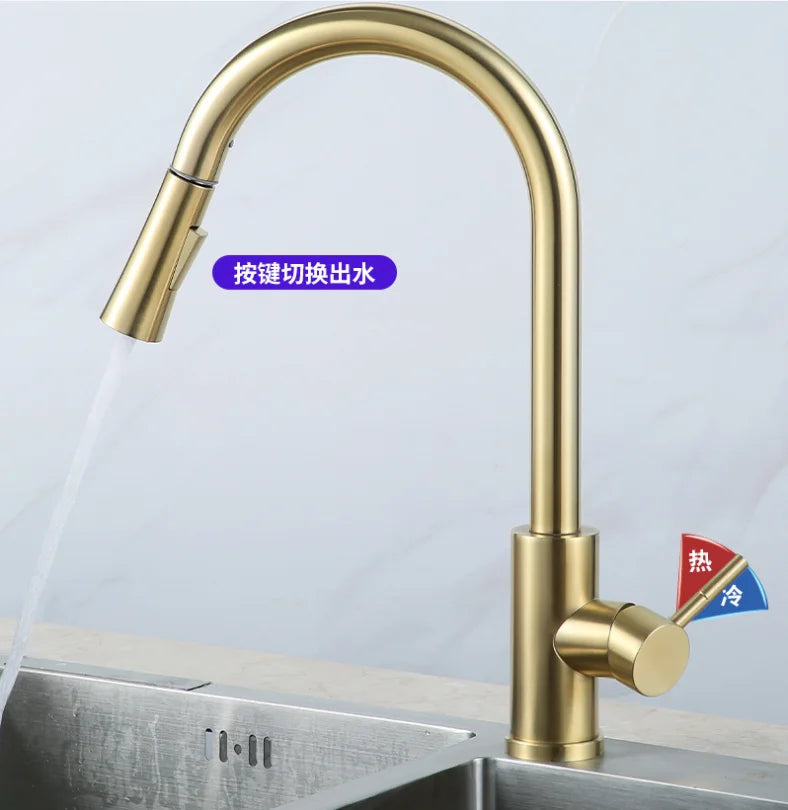 Stainless Steel Hot Cold Water Faucet Gold Pull-out Sprayer Single Handle