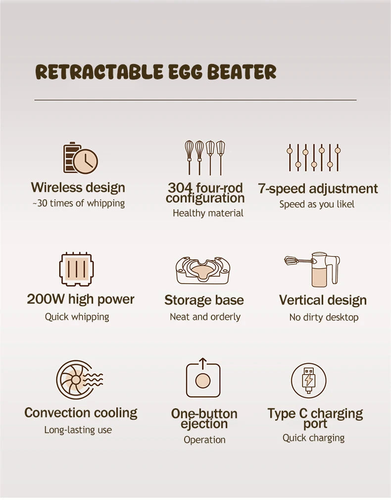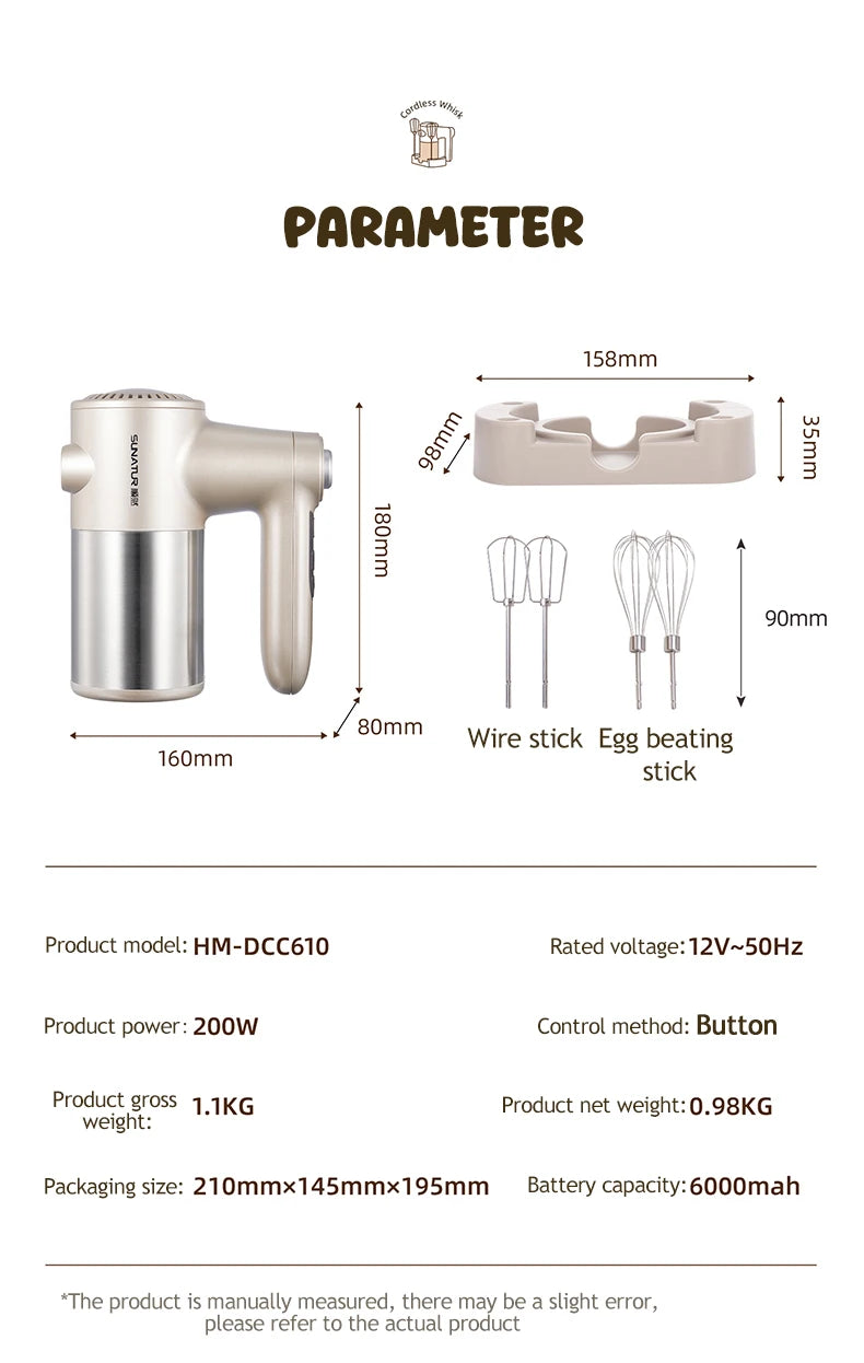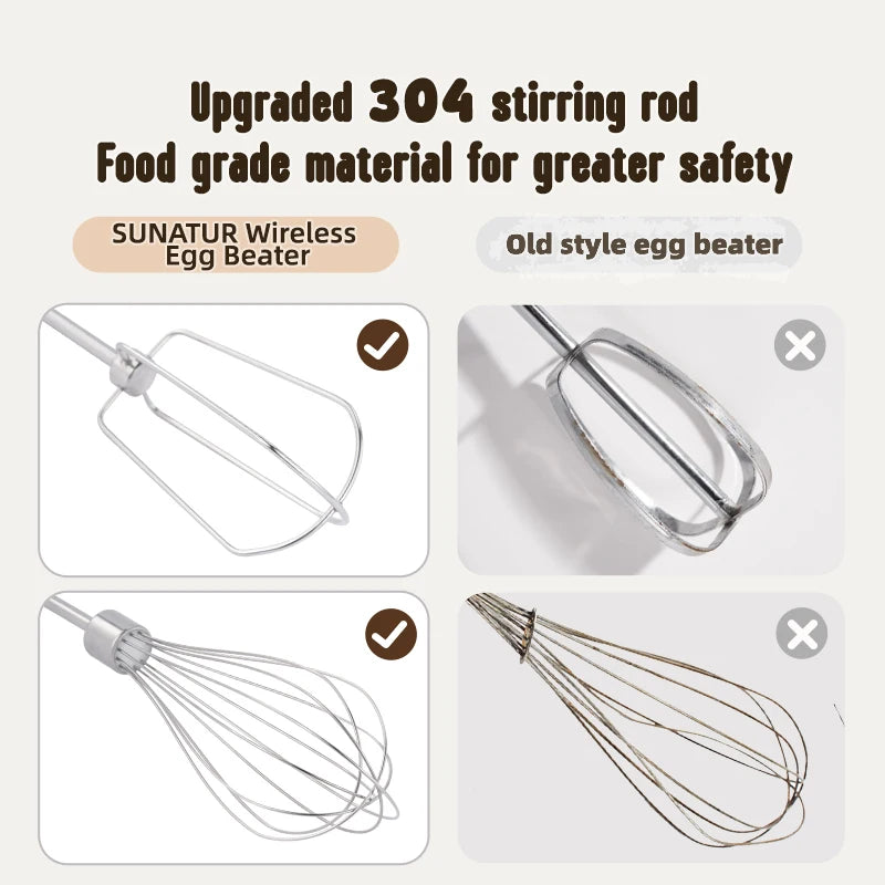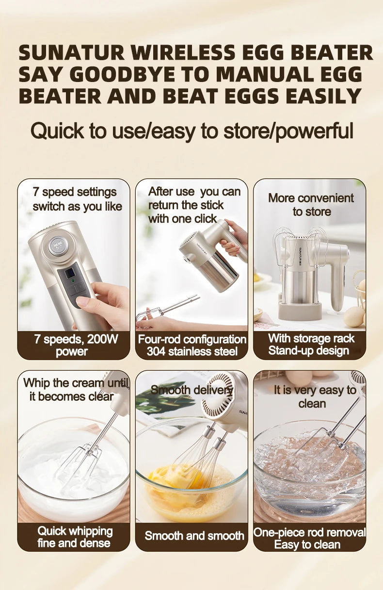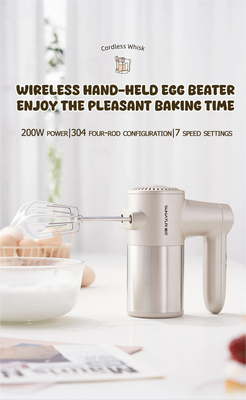 SUNATUR Handheld Electric Mixer Wireless Charging ,Egg Beater, Cream Whipper 200W power 7 - Speed
