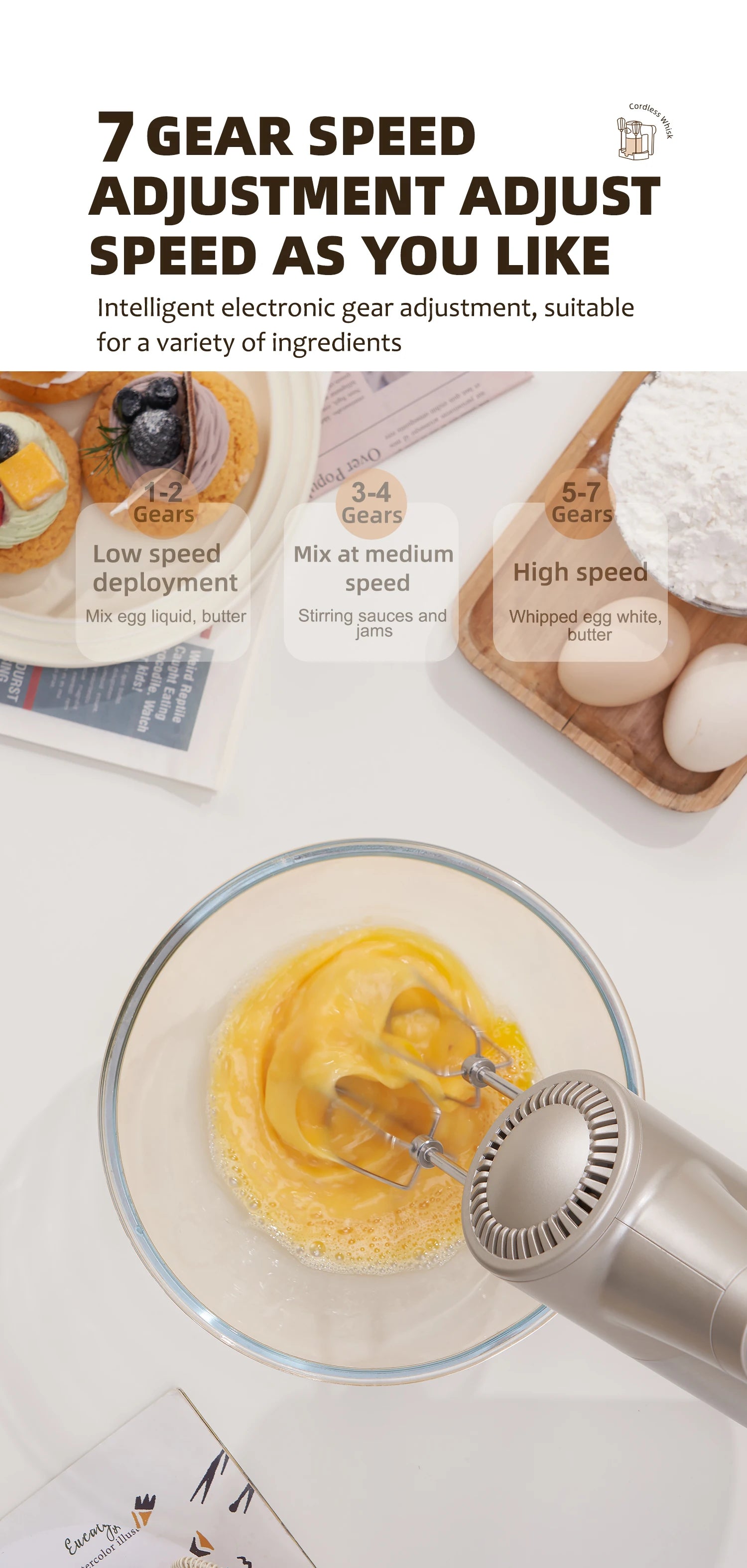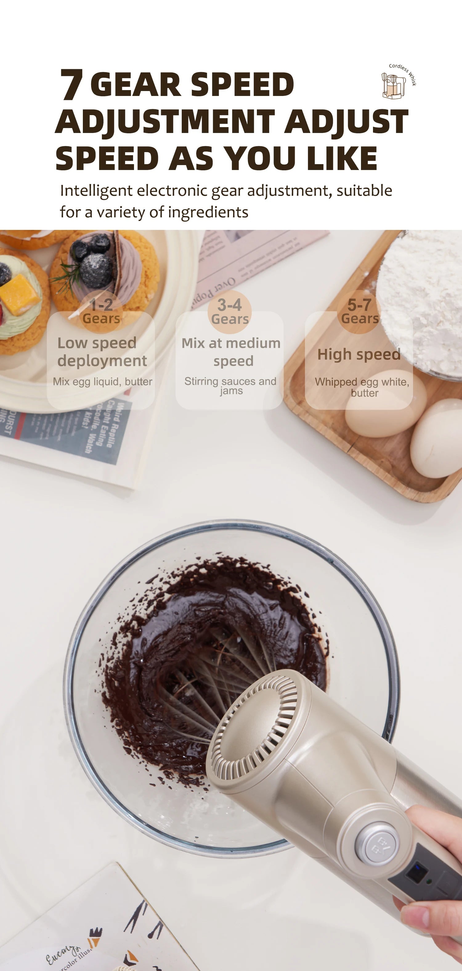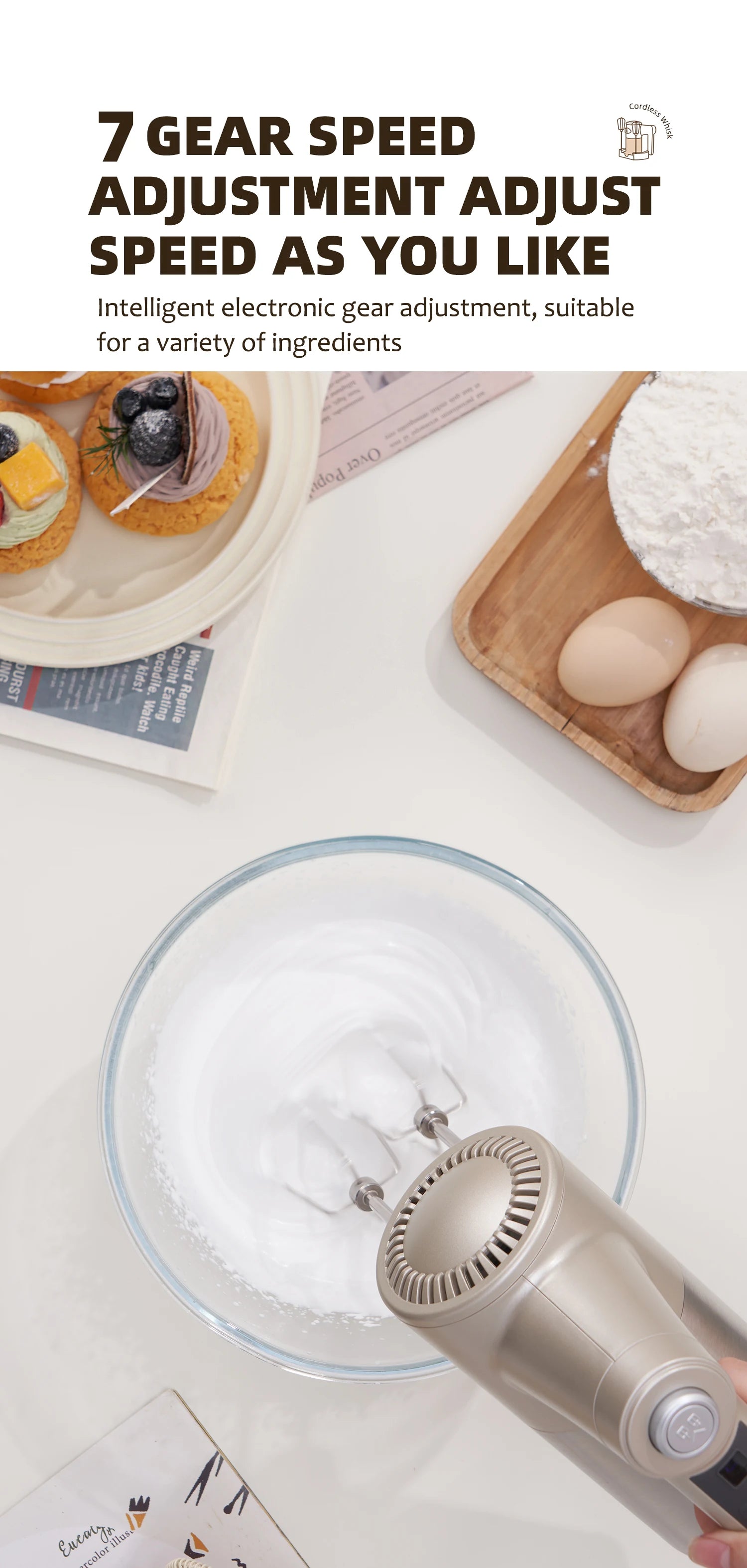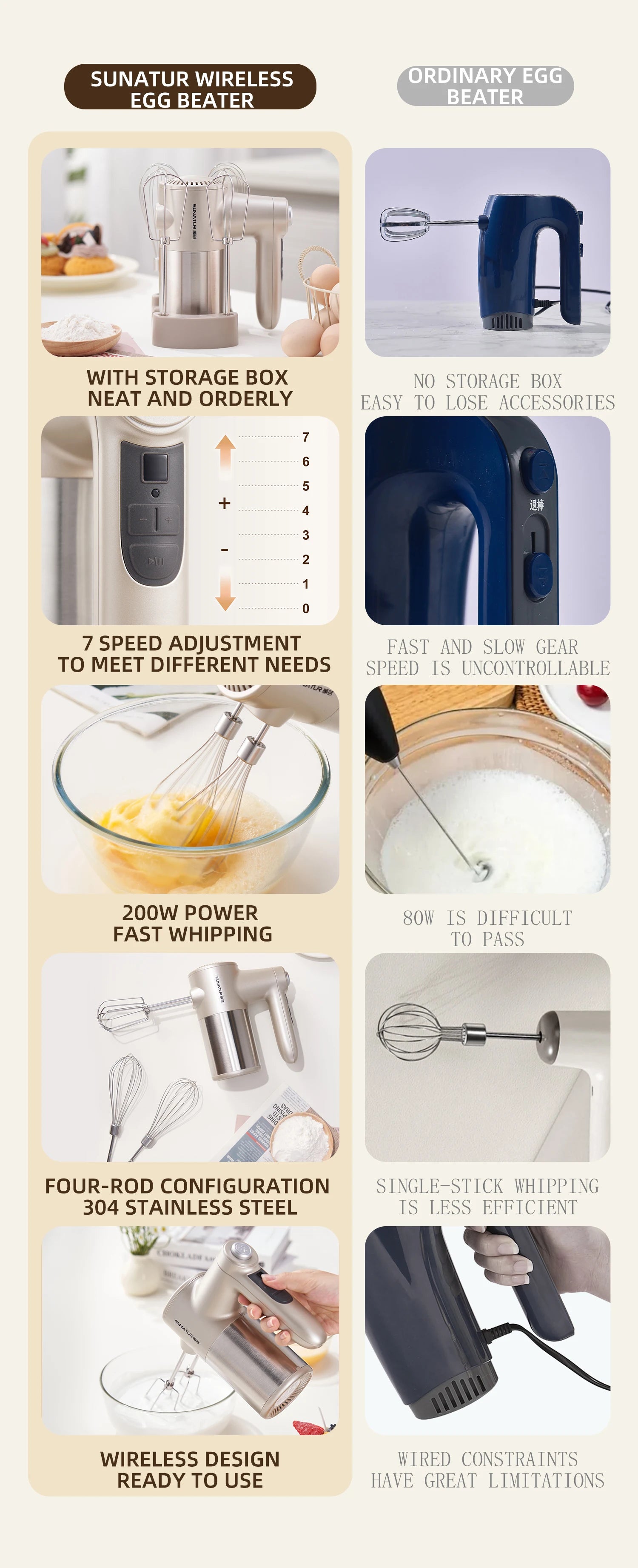 SUNATUR Handheld Electric Mixer Wireless Charging ,Egg Beater, Cream Whipper 200W power 7 - Speed